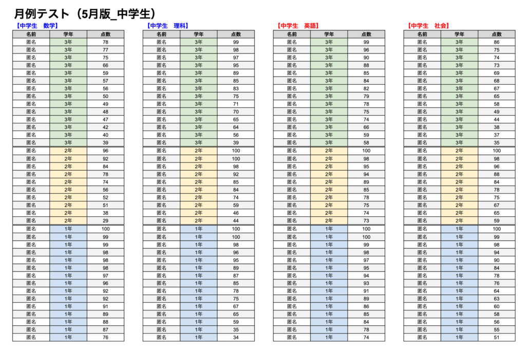※ 当塾では各科目を担当する講師が毎月テストを実施し、結果を保護者様に配信します。