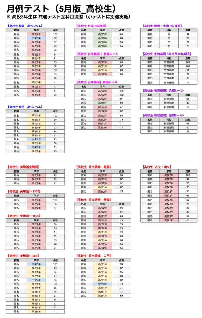 ※ 高校3年生は共通テスト模試を毎月実施(2025年は4月から実施)。未学習分野があるのは承知で「今何点取れるのか」「目標まで何点足りないのかを」知ることが大事!!